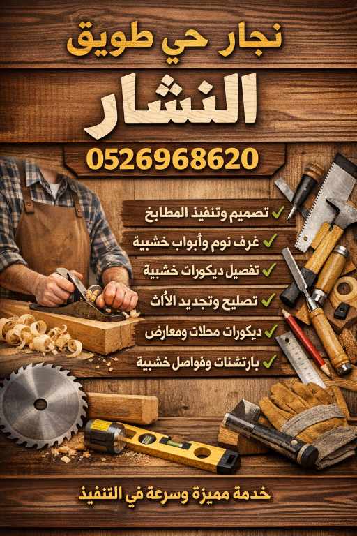 نجار حي طويق هل تبحث عن نجار محترف في حي طويق؟ نوفر لك أفضل خدمات النجارة المتكاملة التي تجمع بين الدقة في التنفيذ والسرعة في الإنجاز. سواء كنت ترغب في تركيب غرف نوم جديدة، أو صيانة أبواب منزلك، فنحن هنا لخدمتك على مدار الساعة.